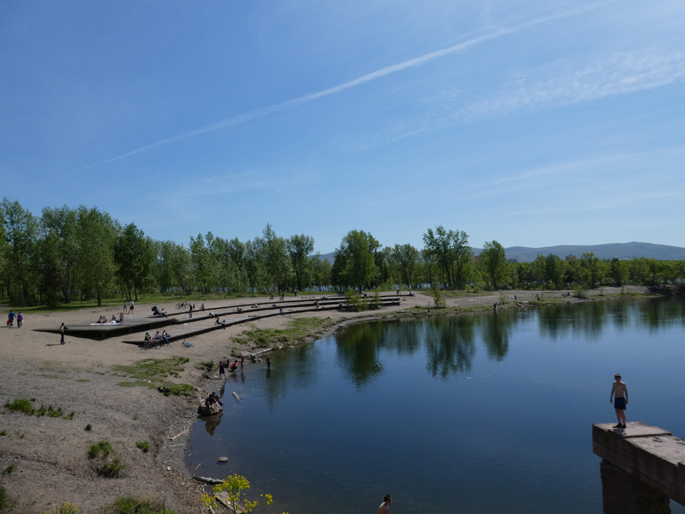 Das andere Wahrzeichen von Krasnojarsk und abgebildet auf der 10-Rubel Note ist der Damm zur Stromgewinnung. Leider waren die Busverbindungen unglücklich gelegen, so dass wir ihn vor der Abreise nicht besuchen konnten. Stattdessen konnten wir das ausgelassene Treiben auf der nahegelegenen Insel miterleben. Die Insel ist ein grosser grüner Park und ist über eine Fussgängerbrücke mit dem Festland verbunden. Am Wochenende wird dort alles gefahren was Räder hat, geschwommen und spaziert.