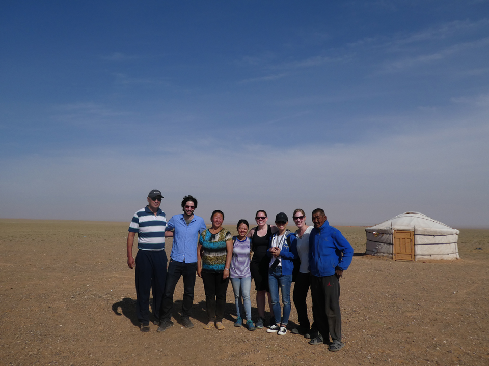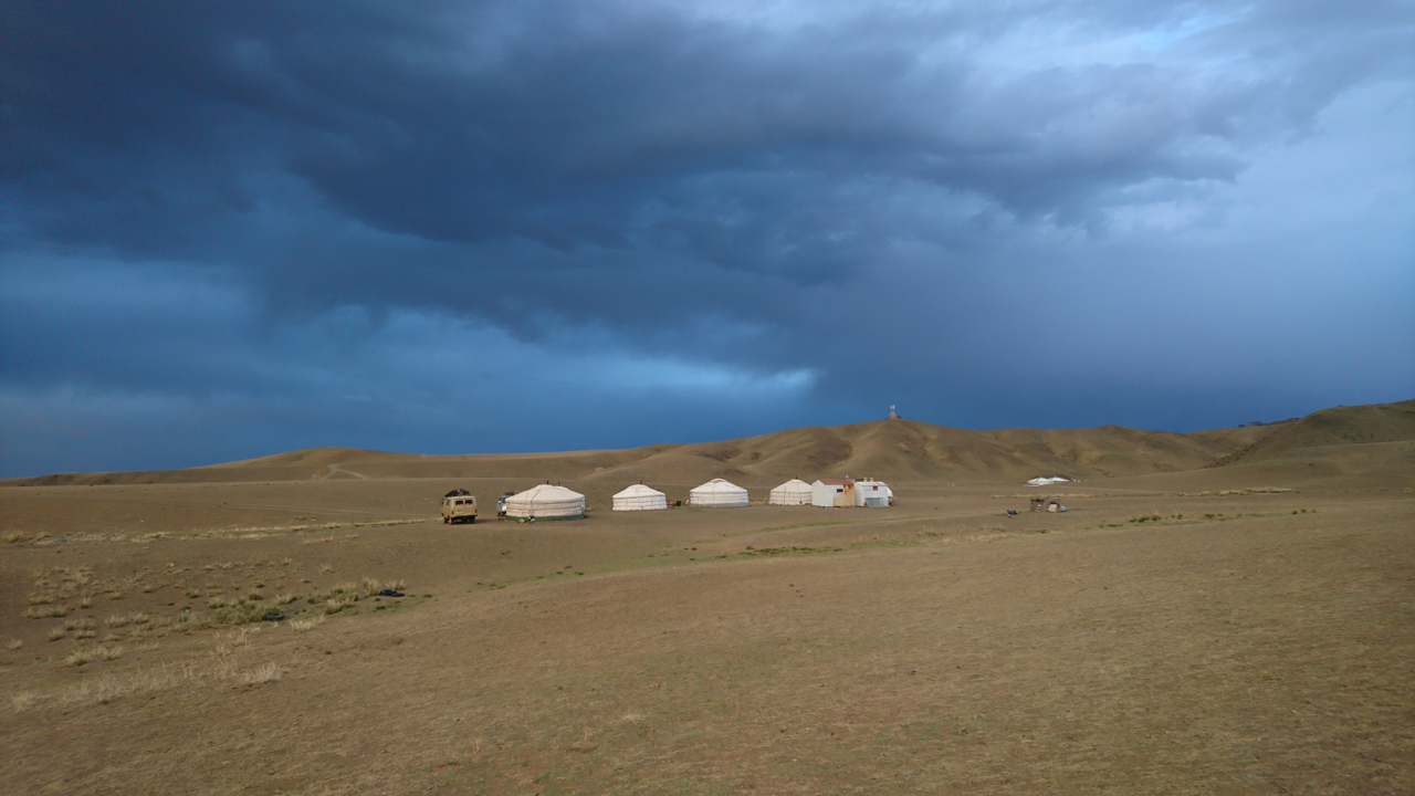 Après une marche rafraîchissante dans la gorge, nous remontons la vallée et atteignons notre camp pour la nuit à l’entrée de la vallée vers 18h. Ce camp d’été est composé de 5 yourtes et tenu par une une seule femme qui vit de l’artisanat. Elle rejoint Dalanzadgad l’hiver pour échapper à la rigueur hivernale. Zolsaya nous prépare un délicieux repas et nous échangeons à propos de nos différentes cultures au sein du groupe. Vers 20h, une fine pluie fait son apparition mais les quelques gouttes bienvenues ne durent pas longtemps. Kath rencontre un couple de suisse allemand à la yourte d’à côté, le monde est petit ;-). Cette troisième nuit sera une nouvelle fois très agréable dans le calme et le silence des montagnes.