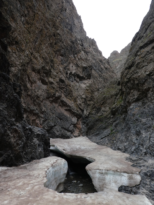 Nous reprenons la route vers 15h et entrons plus profondément dans Middle Gobi. Yol Valley, notre prochaine destination se trouve dans une chaîne de montagnes appelé “West beauty”, qui fait partie des trois chaines de la région appelées respectivement “West, Middle et East beauties”. Pour atteindre la gorge, il faut remonter une vallée qui devient de plus en plus verdoyante. Après avoir passé le col, la “Yol valley” s’élargie sur un large champ d’herbe traversé par un ruisseau. La vallée devient ensuite plus étroite et se transforme en gorge où après une centaine de mètres on découvre les premières glaces restantes de l’hiver. La glace reste dans la gorge, aux endroits les plus étroits et protégés du soleil jusqu’au mois de juillet. La gorge serpente sur plus de 8 km laissant s’échapper ensuite le ruisseau en direction de Dalanzadgad.