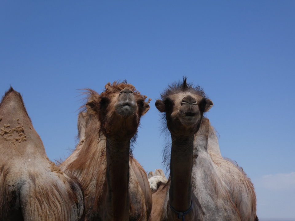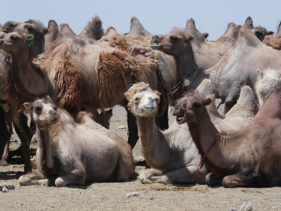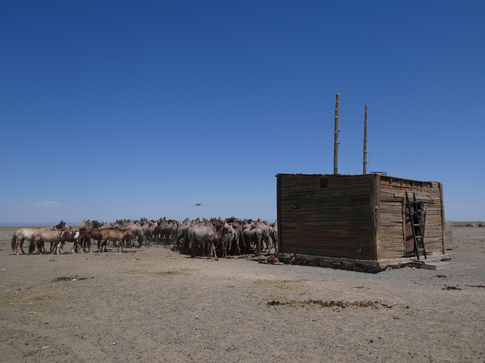 Auf dem Weg zu den Flaming Cliffs haben wir an einer Wasserstelle eine Pause eingelegt. Kamele, Pferde und Ziegen warten bis sie an der Reihe sind. Das Wasser wird tief aus dem Boden gepumpt und die Hirten bringen ihre eigenen Generatoren mit, um die Pumpe zu betreiben. Uns unterhalten die drolligen Kamele bestens bis unser Fahrer Bata für die Weiterfahrt bereit ist.