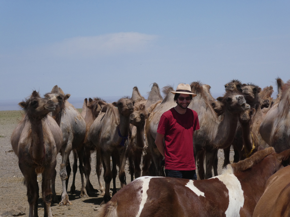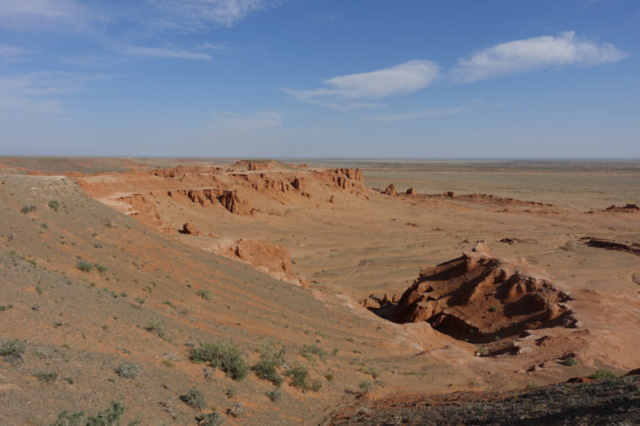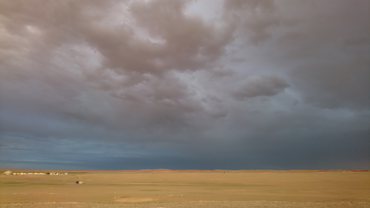 Die Flaming Cliffs ist eine Felsformation in deren Umgebung zahlreiche Fossilien von Wirbeltieren, darunter Dinosaurier, gefunden wurden. Ebenfalls gehören Dinosaurier Eier zu den Funden. Die Felsen bestehen im Wesentlichen aus Sandstein und stammen aus der Zeit der späten Oberkreide. Eigentlich wollten wir sie bei Sonnenuntergang besuchen, doch zog ein Sandsturm auf, weshalb wir beschlossen im Camp zu bleiben und den Besuch auf den Morgen zu verschieben. Eine gute Reisetruppe ist in diesen Momenten Gold wert. Mit spannenden Gesprächen über kulturelle Unterschiede haben wir in der gemütlichen Jurte abgewartet, bis der Sandsturm sich gelegt hat. Und einmal mehr wurden wir mit einer überwältigenden Szenerie beglückt! Ein paar Tropfen Regen reichten aus, um einen doppelten Regenbogen direkt über den Flaming Cliffs zu erzeugen. Einfach nur wow 🙂