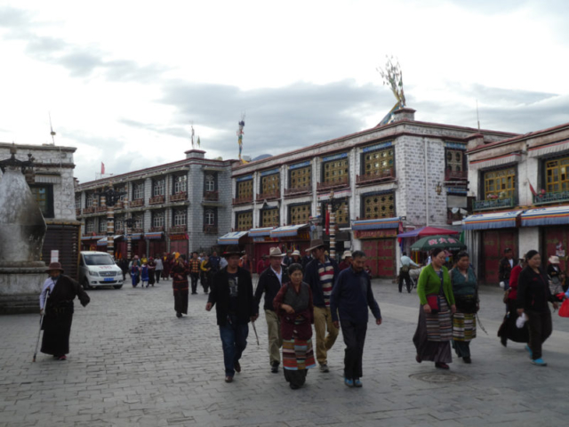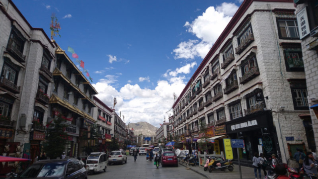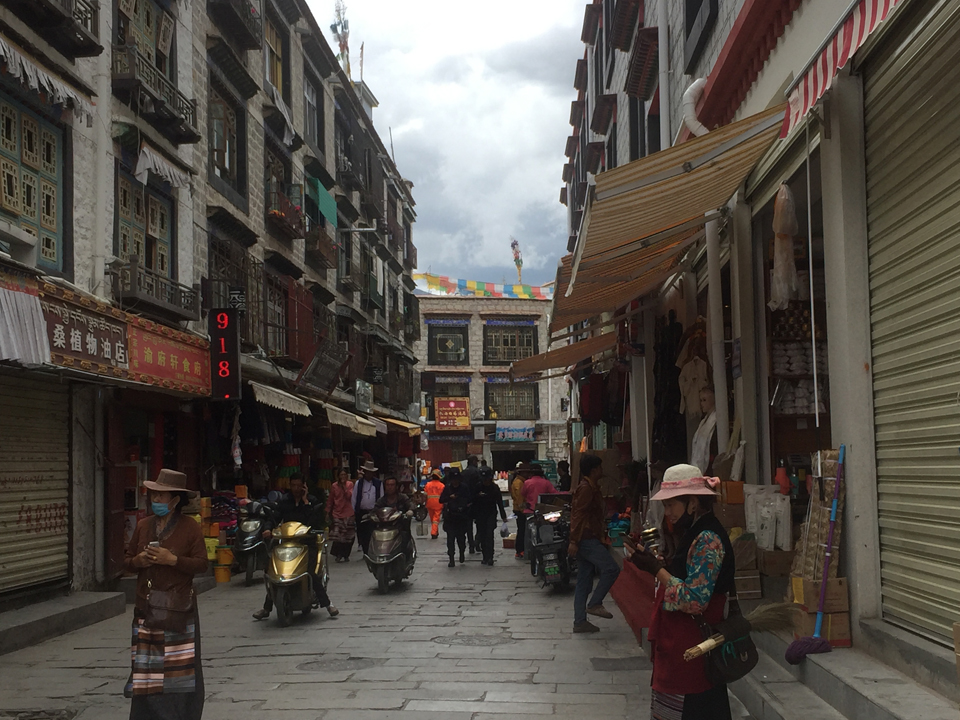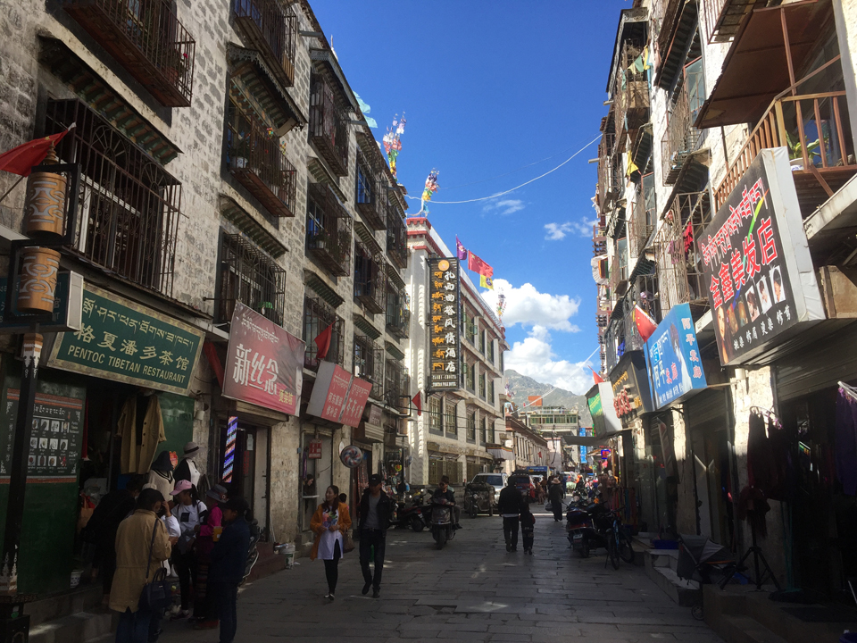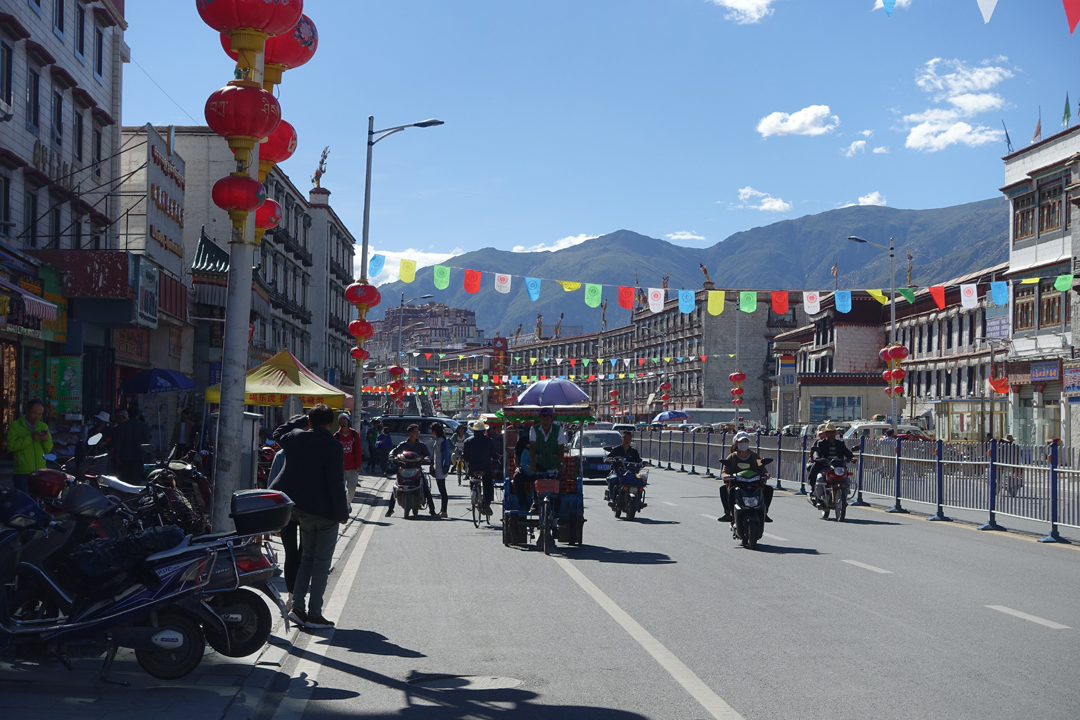 Die Altstadt von Lhasa ist gekennzeichnet von den traditionellen 2 bis 3 Etagenhäusern und den Gebetsfahnen, die sich im Wind bewegen und damit gute Wünsche in den Himmel tragen. Zudem zieren neben den Gebetsfahnen aber auch auffallend viele chinesische Flaggen die Häuser. Gleichzeitig ist die Dichte der Polizei- und Kontrollposten hier am grössten.