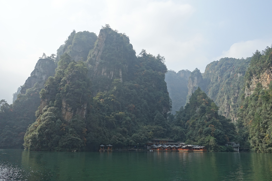 Baofeng Lake is bordered by lush green trees and shrub-clad stone peaks of various shapes that enclose the emerald lake and give it a fairytale-like atmosphere.