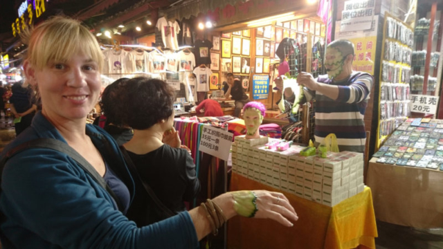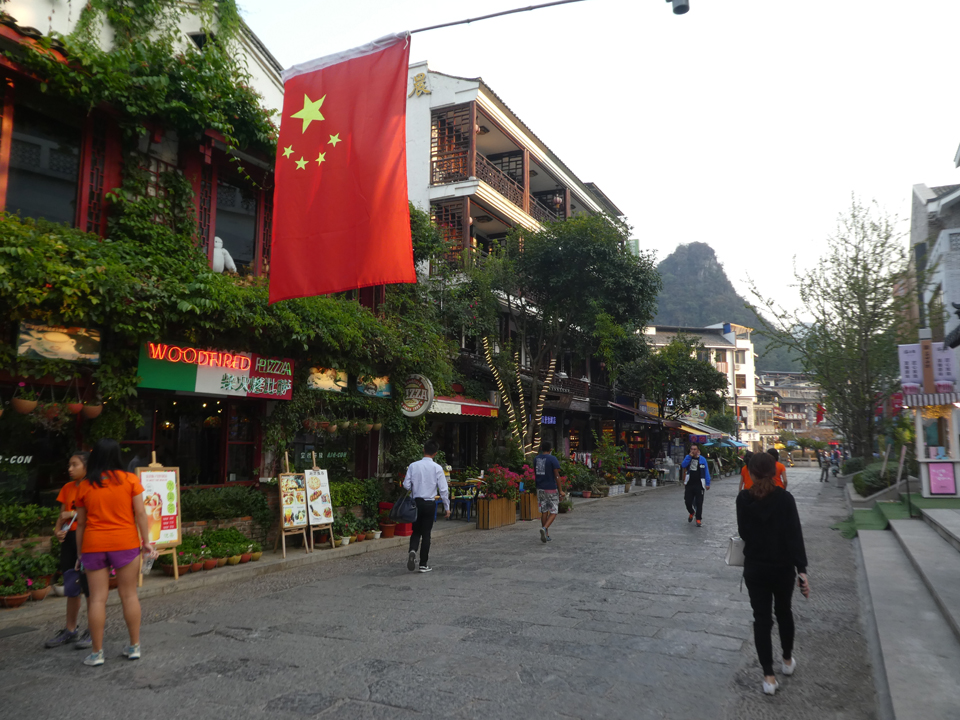 Yuongshuo wird dem Ruf einer Touristenstadt gerecht. In den belebten Strassen lässt sich allerlei an Souvenirs finden (die wir nicht kaufen, da wir ja alles in den Rucksack packen und mittragen müssen) und es wird einem von Pommes und Pizza bis hin zu exotischen Snacks alles angeboten. Besonders zum Lachen bringt uns der Gurkenstreifenschneiderverkäufer. Er demonstriert an sich selbst, wie hauchdünn Gurkenstreifen sein können und verteilt auch rege Muster.