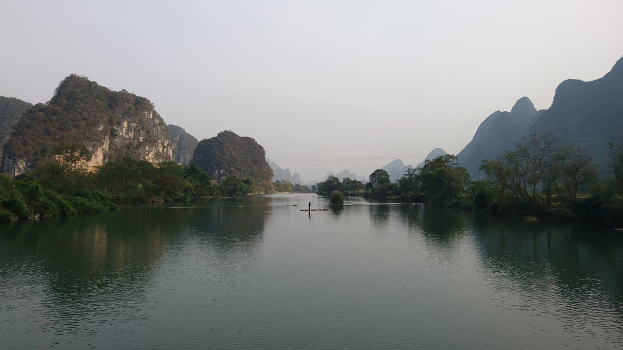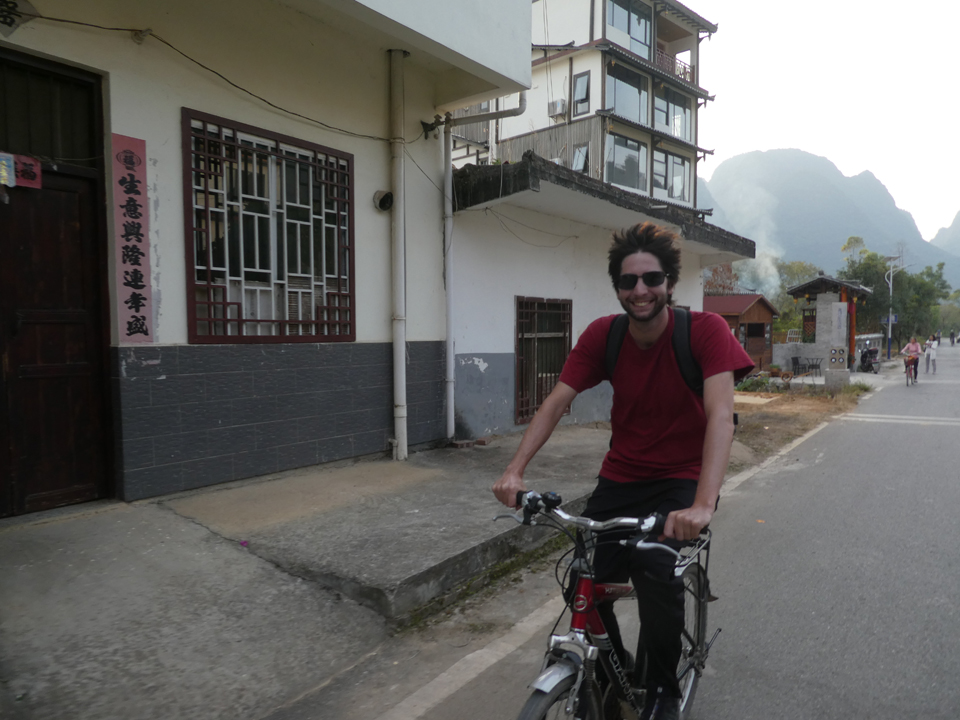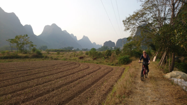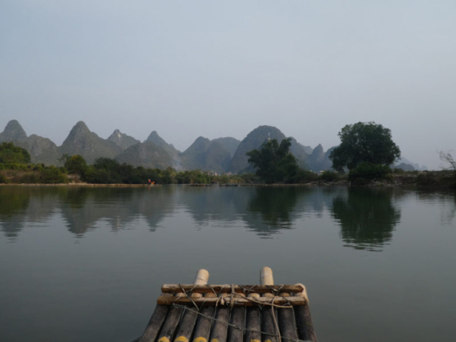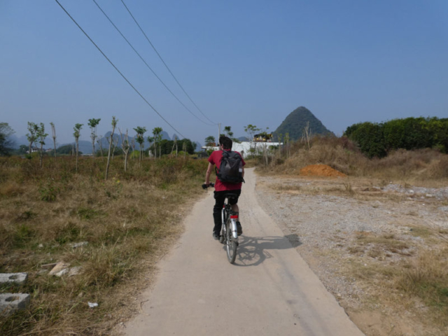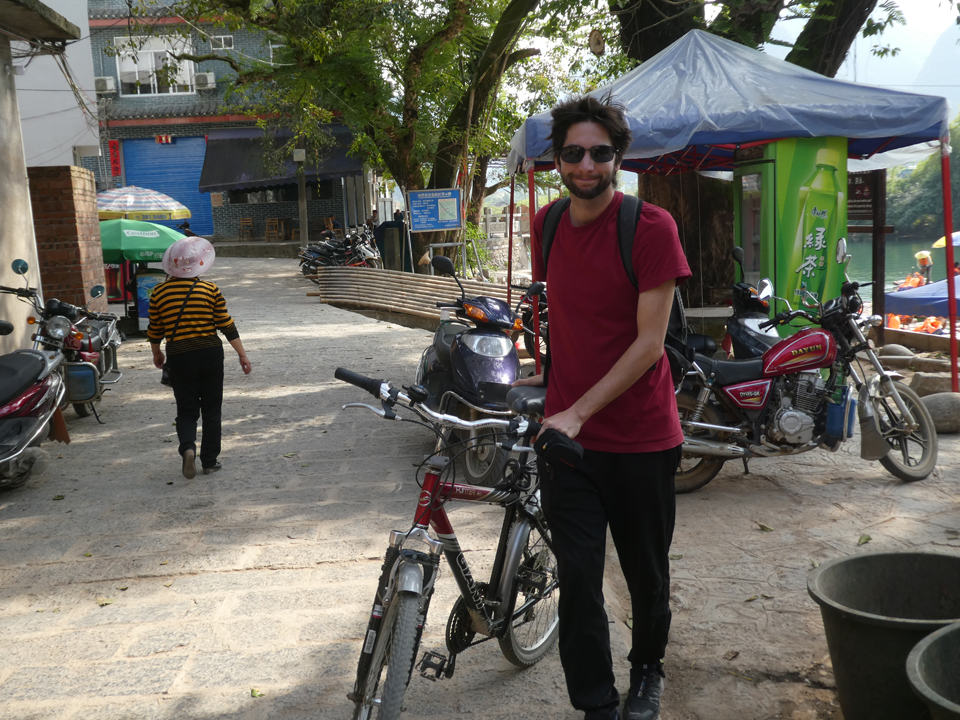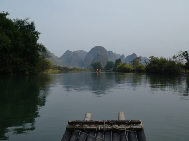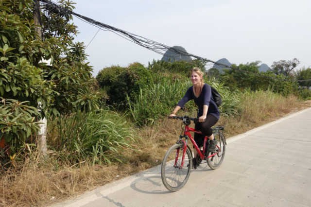 Die Gegend um Yangshuo ist ideal zum Radfahren! Denn alles zwischen den Karstfelsen ist flach. 😉 Im Hostel mieten wir ein Mountain-Bike und radeln los. Unser Ziel ist der Yulong Fluss, der sich wie der Li Fluss durch die Karstfelsen windet. Zudem kann auf dem Yulong Fluss ein Bambusboot (aus richtigem Bambus und nicht aus Plastik) gemietet werden und ein Fährmann manövriert einem den Fluss hinab.