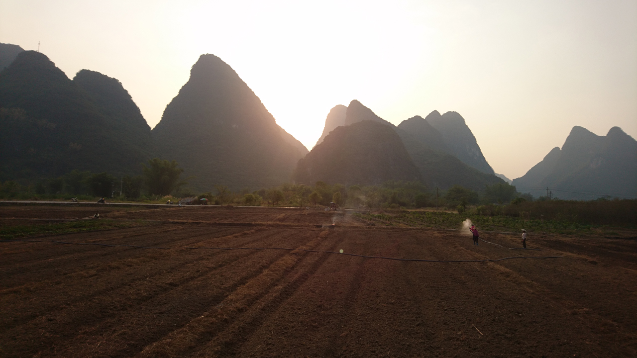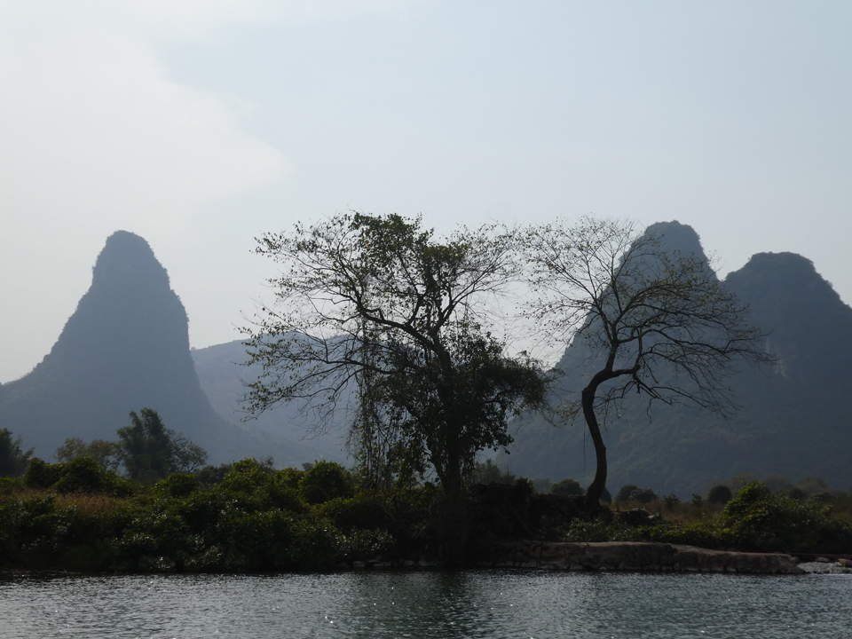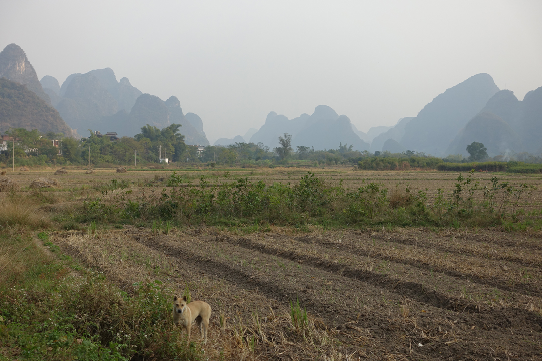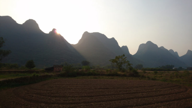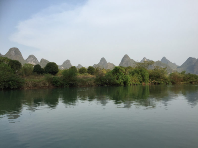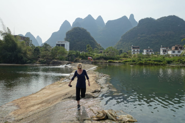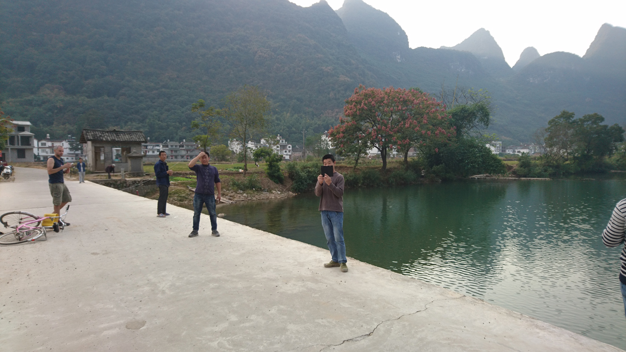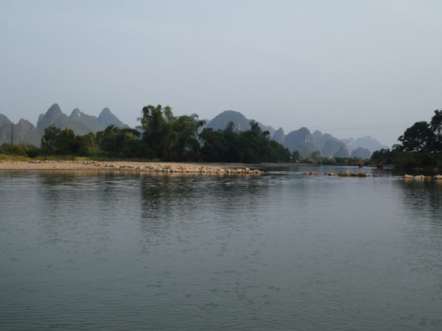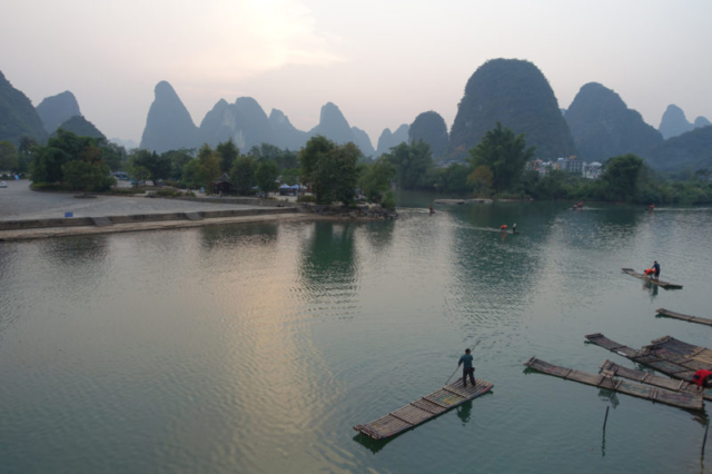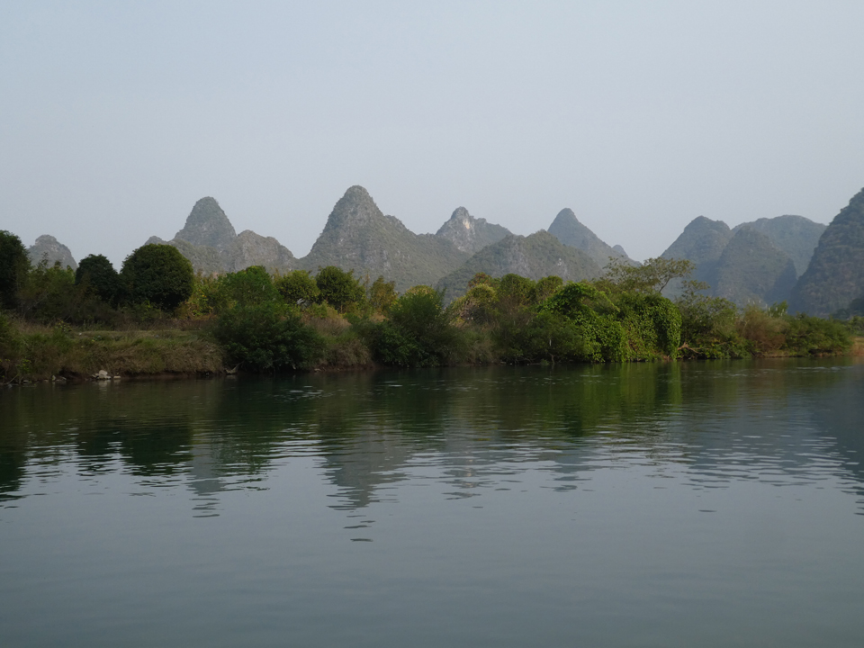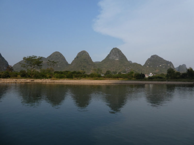 Die Rückfahrt nach Yangshuo war das Highlight des Tages. Der schmale Radweg folgt dem Spiegel glatten Fluss und schlängelt sich durch ländliche Dörfer sowie entlang von leeren Feldern. Im Licht der untergehenden Sonne wird alles um so schöner und wir halten bei so mancher hübschen Szene und an mehr als einem bezauberndem Flussabschnitt.