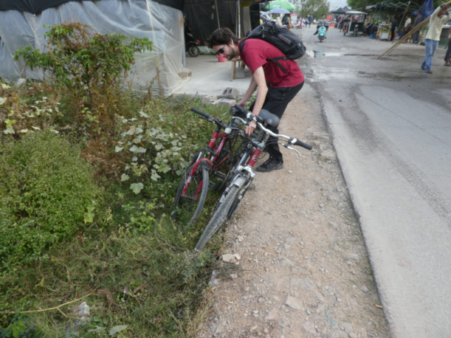 Lange müssen wir nicht warten, bis uns ein Floss angeboten wird. In gebrochenem Englisch gibt uns eine Frau den Preis zu verstehen und dass wir ihr (wohl zur Ablegestelle der Flosse) folgen sollen. Ohne genau zu wissen, wohin es geht, schwingen wir uns in den Sattel und folgen ihr. Etwas witzig ist es schon, einer Unbekannten, die auf einem Kindervelo ein respektables Tempo hinlegt, irgendwohin hinterher zu radeln. 😉