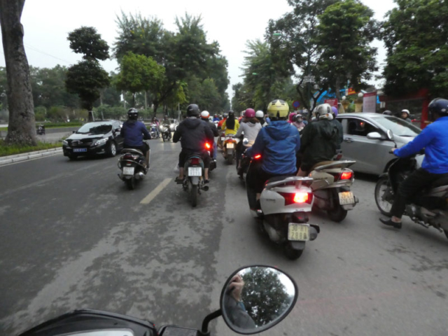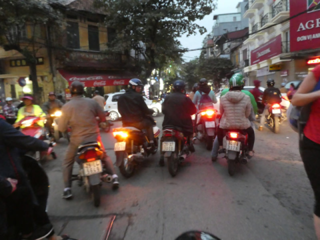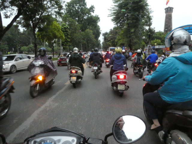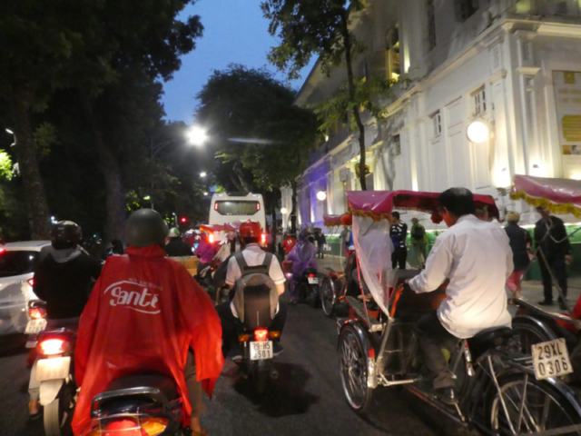 Die Altstadt ist sehr lebendig. Gefühlt fliessen tausende von Roller und kleine Motorräder durch die Strassen und Gassen. Und tatsächlich fliesst der Verkehr, solange es nur Motorräder sind. Sobald ein Auto auftaucht, gibt es Stau. Auch die Trottoirs gehören zum Alltagsleben. Entweder zum Parken der Zweiräder oder zum Kochen und Essen. Überall gibt es kleine “mobile Garküchen” bestehend aus einem Kocher, ev. einem Tischchen (10 cm über dem Boden) mit den Zutaten und kleinen Plastikstühlen drum herum. Besonders am Morgen zum Frühstück sind alle Stühle besetzt und es wird vietnamesische Nudelsuppe “Pho” geschlürft. Platz zum Gehen gibt es auf den Gehsteigen kaum, dafür kann man ja aber auch die Strasse benutzen. Die Motorräder finden ihren Weg schon um einen herum. 😉