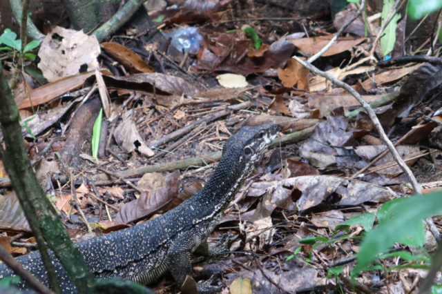 Pascal entdeckt einen Bindenwaran im Dickicht, der sich mit seiner blauen Zunge züngelnd davon macht.