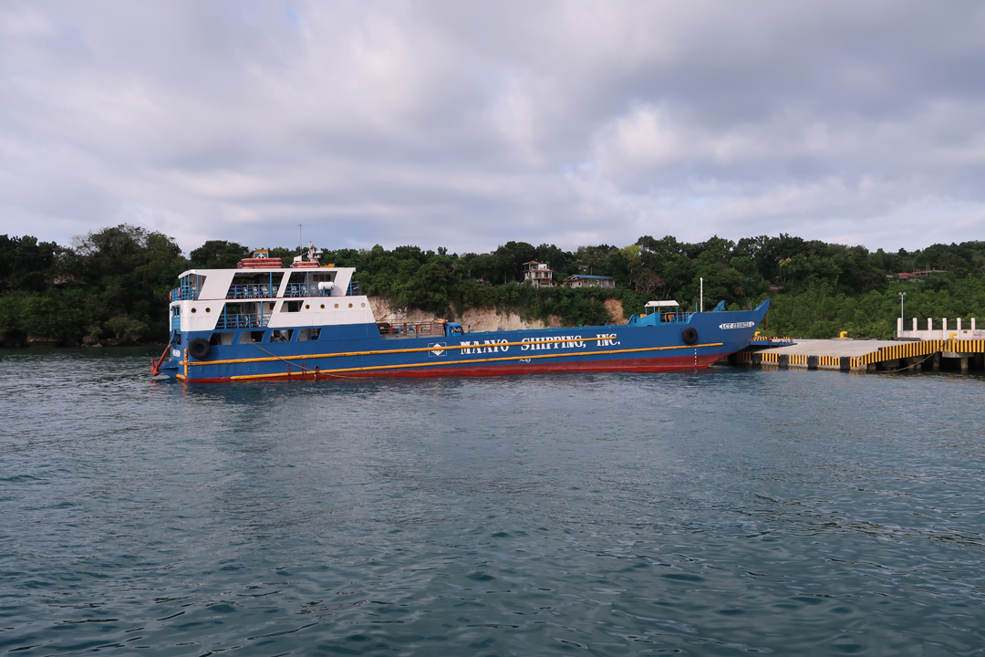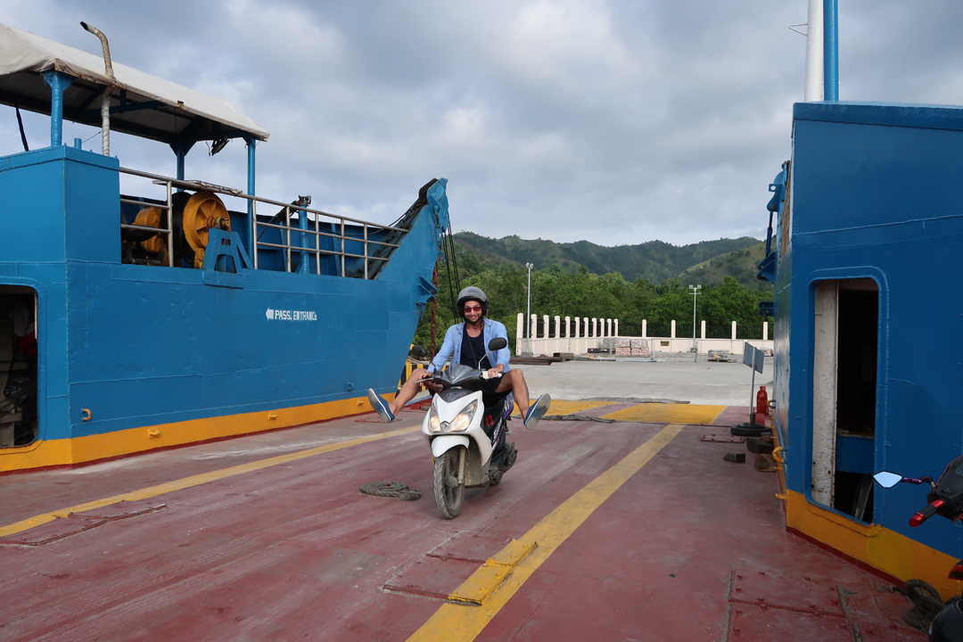 En fin d’après midi, nous nous enregistrons pour le ferry à Larena. Ici, moins de paperasse qu’à Dumagete, nous sommes sur le ferry en moins de 5 minutes.