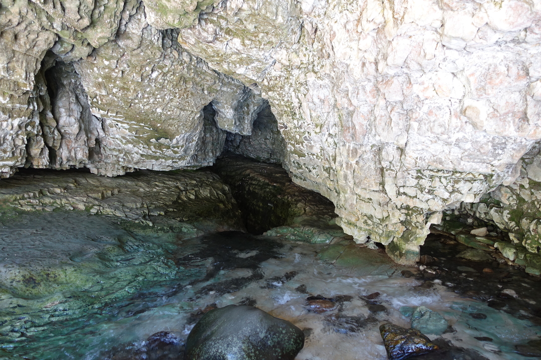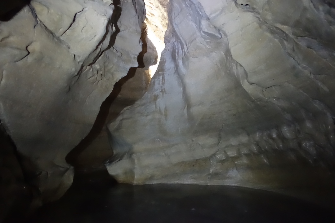 Après une demie-heure à remonter le ruisseau dans l’eau plutôt fraîche, on aperçoit avec enthousiasme la lumière de la sortie derrière le dernier bassin.