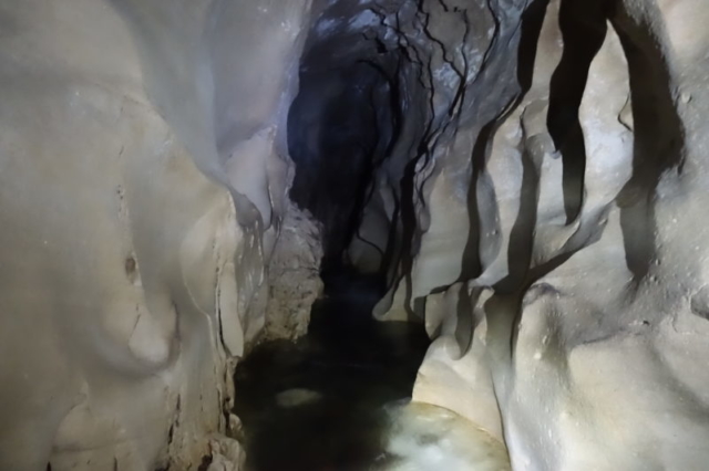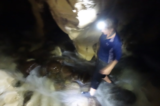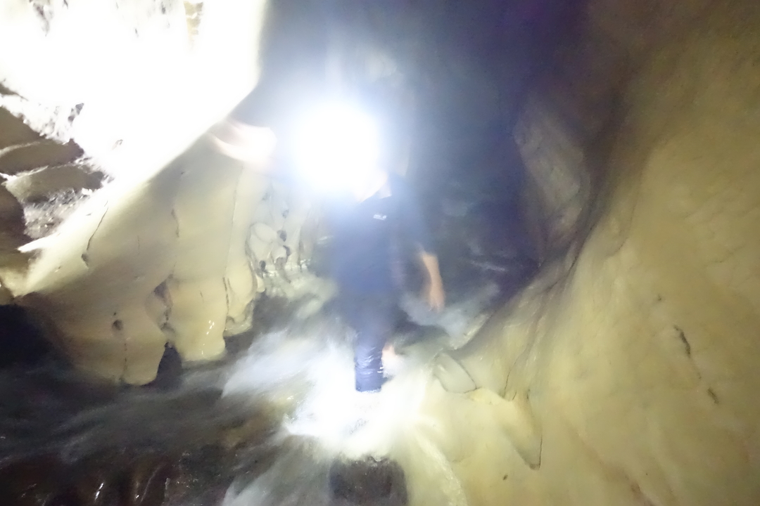 Après quelques dizaines de mètres, on est plongé dans le noir et on progresse avec nos lampes frontales face au courant.
