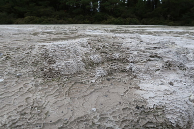 Les eaux de la “Champagne Pool” ainsi que d’autres sources adjacentes s’écoulent ensuite le long d’un plateau légèrement incliné formant de minuscules terrasses, teintéss des couleurs des différents minéraux.