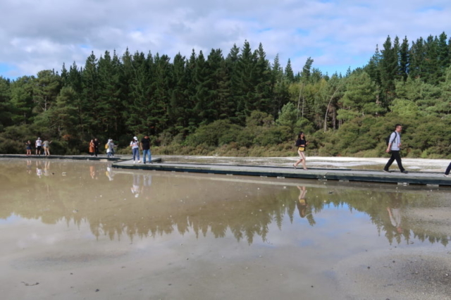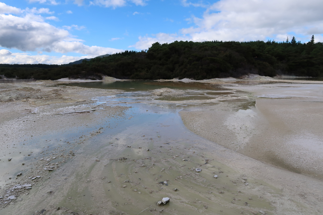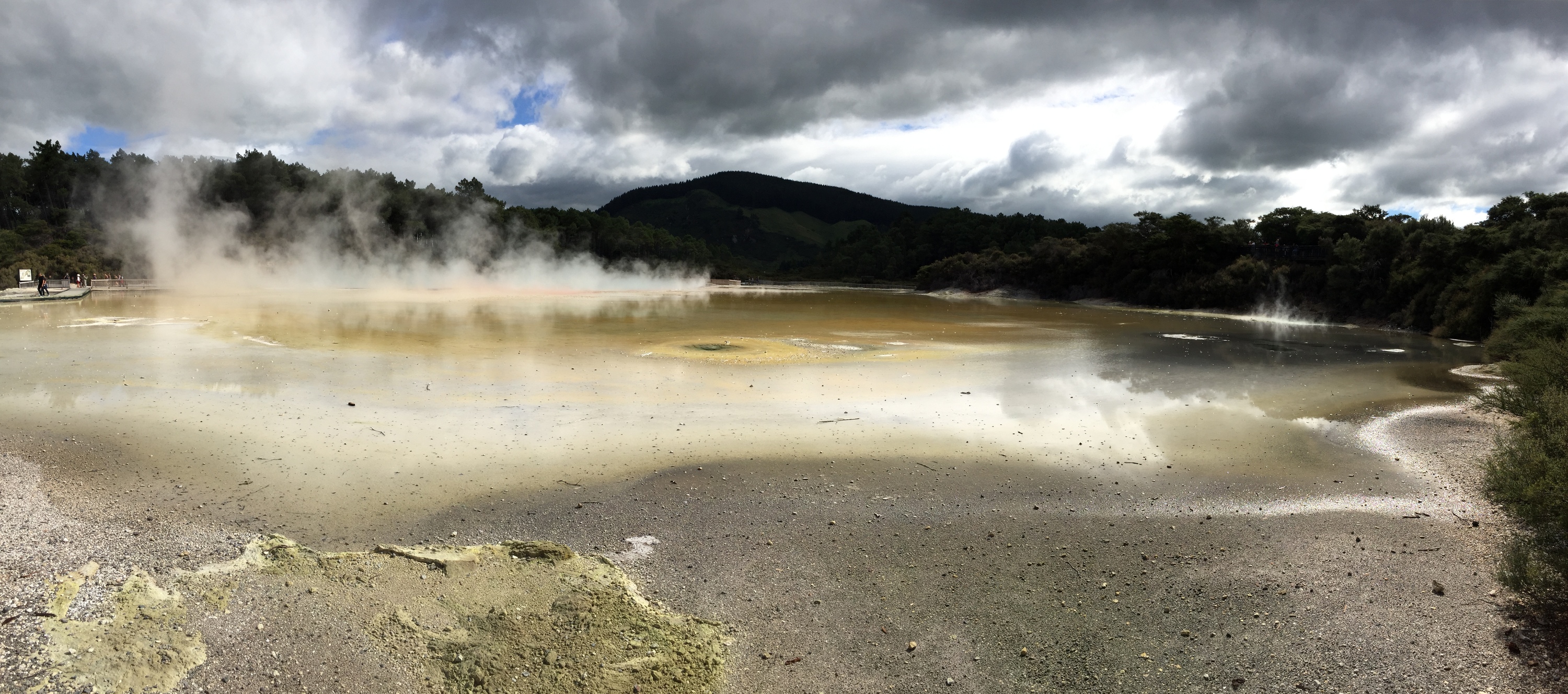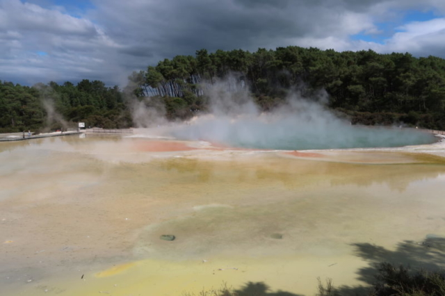 Nous poursuivons plus au nord et marquons notre prochain arrêt à Waiotapu (Wai-O-Tapu), une zone géothermique active où les activités souterraines bouillonnantes se présentent sous toutes les formes: cratères bouillonnants, grottes sulfureuses, sources d’eau chaude, geysers, mares de boue, …