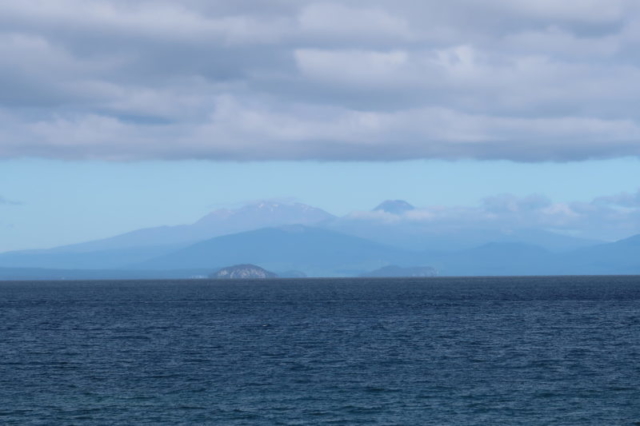 Après avoir remonté le lac Taupo par le côté ouest, nous faisons à nouveau halte à Taupo, le temps de grignoter quelque chose au bord du lac. En toile de fond, on distingue les volcans du Tongariro dont le cône volcanique du Mount Ngauruhoe.
