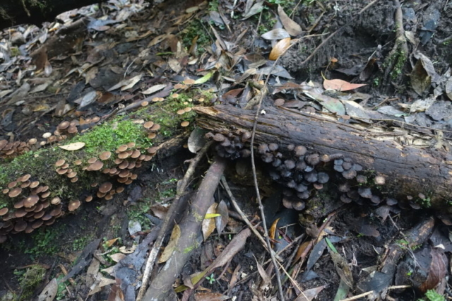 Zwischen in die Höhe gucken und den Boden nach Pilzen absuchen, können wir auf Augenhöhe Grüne Rosellas beobachten, wie sie Zweige von Farnbäumen verspeisen.