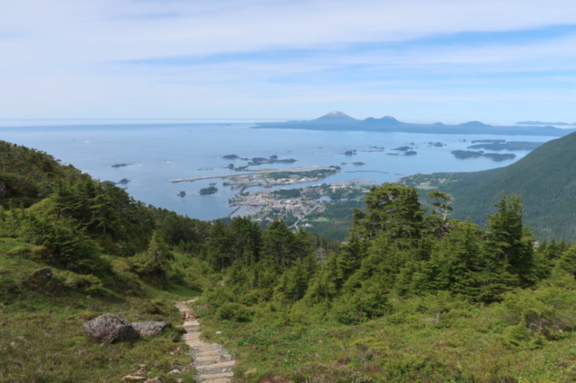 Nous sommes seuls au sommet le temps du repas, bientôt rejoint par un autre couple d’américains, aussi en visite à Sitka pour quelques temps.