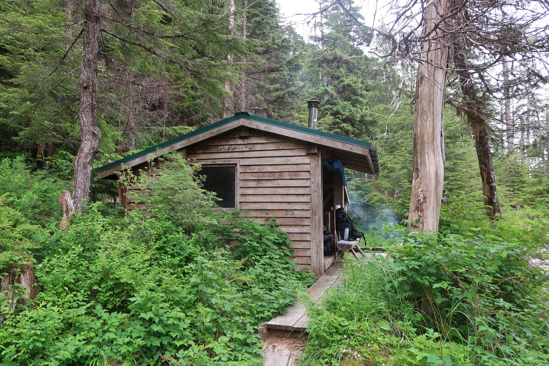 Le volcan se trouve sur l’île de Kruzof, à 16 km de Sitka, que l’on rejoint en bateau. Barth nous y dépose avec le skiff le samedi en début d’après-midi et reviendra nous chercher en fin d’après-midi le lendemain. Au programme pour aujourd’hui, rejoindre le refuge à mi-chemin où l’on passera la nuit, avant de poursuivre l’ascension demain matin.