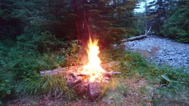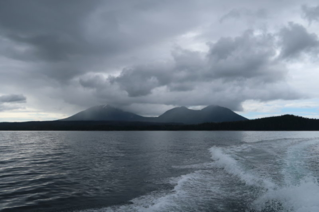 Le volcan se trouve sur l’île de Kruzof, à 16 km de Sitka, que l’on rejoint en bateau. Barth nous y dépose avec le skiff le samedi en début d’après-midi et reviendra nous chercher en fin d’après-midi le lendemain. Au programme pour aujourd’hui, rejoindre le refuge à mi-chemin où l’on passera la nuit, avant de poursuivre l’ascension demain matin.