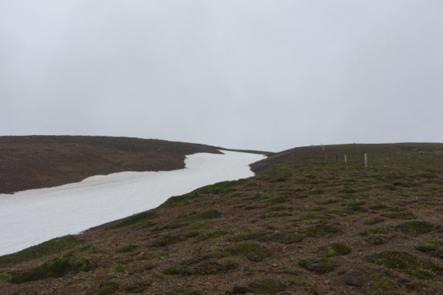 Peu avant le sommet, nous longeons un grand névé et l’on recharge nos gourdes des dernières neiges.