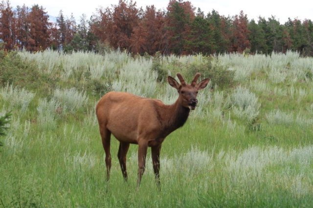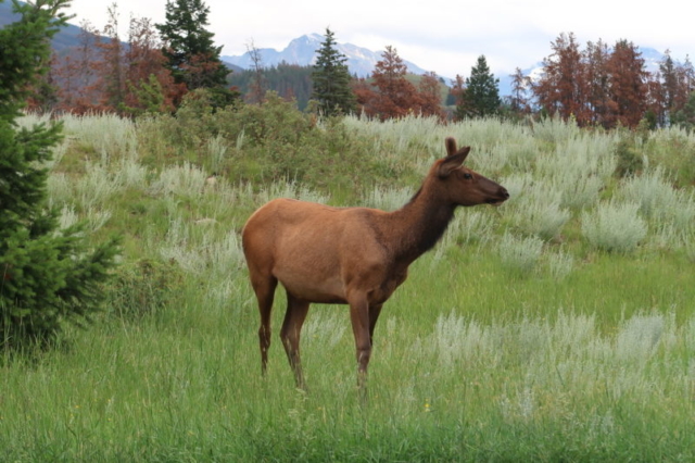 Obwohl, auch wenn wir diese Tage nicht nach der Wildnis suchen, kommen wir in Jasper auf unsere Kosten. Auf dem Campingplatz spaziert wenige Meter von uns ein Schwarzbär vorbei und gleich nach dem Campingtplatz treffen wir auf einen Braunbären etwas abseits des Strassenrands. Kaum 5 Minuten später kreuzen 3 Kojoten vor uns die Strasse und mitten in Jasper tummeln sich Elks auf der Strasse und den (unbefahrenen) Geleisen!