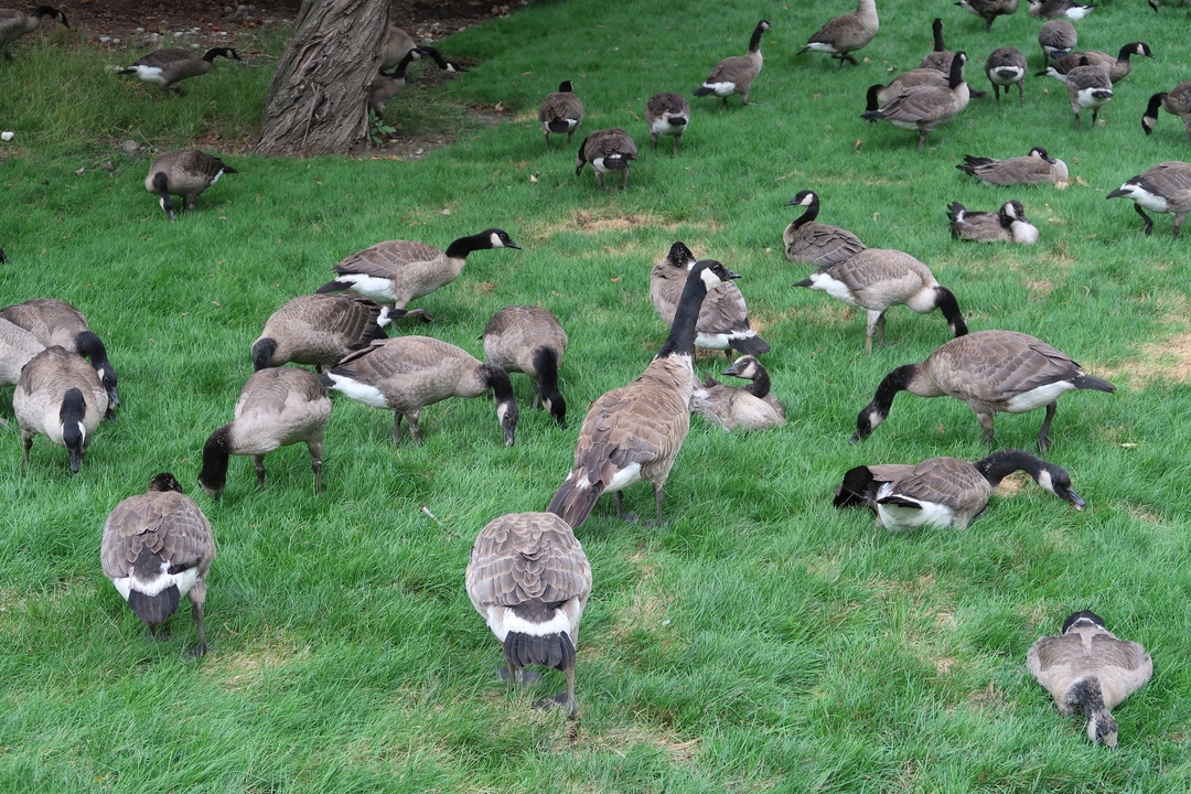 Besonders aufpassen muss man im Park allerdings auf die Kanada Gänse. Sie sind in grosser Zahl vertreten und wir beobachten, wie ein asiatischer Tourist von 5 Gänsen verfolgt wird, nachdem er sie mit Brot gefüttert hat. Scheu sind die Tiere nicht! Auch die Hinterlassenschaften der Vögel ist nicht ohne. Ins Gras sitzen würde ich in diesem Park also nicht! 😉