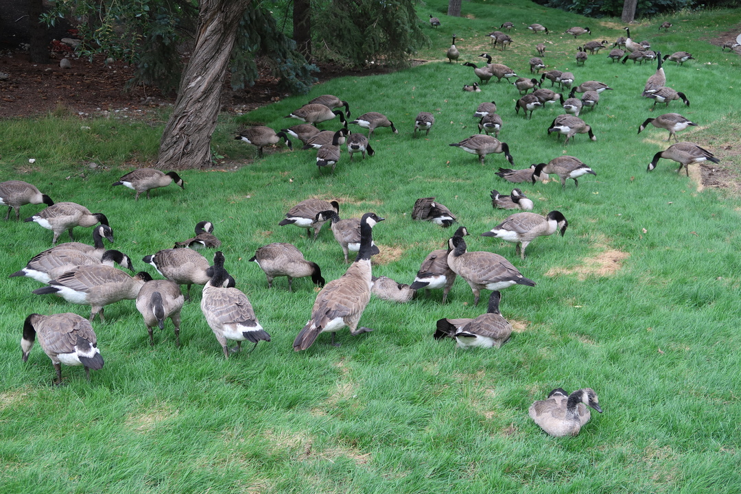 Besonders aufpassen muss man im Park allerdings auf die Kanada Gänse. Sie sind in grosser Zahl vertreten und wir beobachten, wie ein asiatischer Tourist von 5 Gänsen verfolgt wird, nachdem er sie mit Brot gefüttert hat. Scheu sind die Tiere nicht! Auch die Hinterlassenschaften der Vögel ist nicht ohne. Ins Gras sitzen würde ich in diesem Park also nicht! 😉