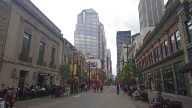 Heute steht das Stadtzentrum auf dem Plan. Eigentlich möchten wir 2-3 Stunden etwas flanieren, die Altstadt erkunden und uns einen Kaffee in der bekannten Stephen Avenue leisten. Als wir aber realisieren, dass wir für 3 Stunden ca. 36 kanadische Dollar nur fürs Parkhaus bezahlen würden, kürzen wir das ganze etwas ab. 😉 Auch so können wir die Kombination aus alt und modern in der Innenstadt bestaunen und einen Blick auf den Calgary Turm werfen.