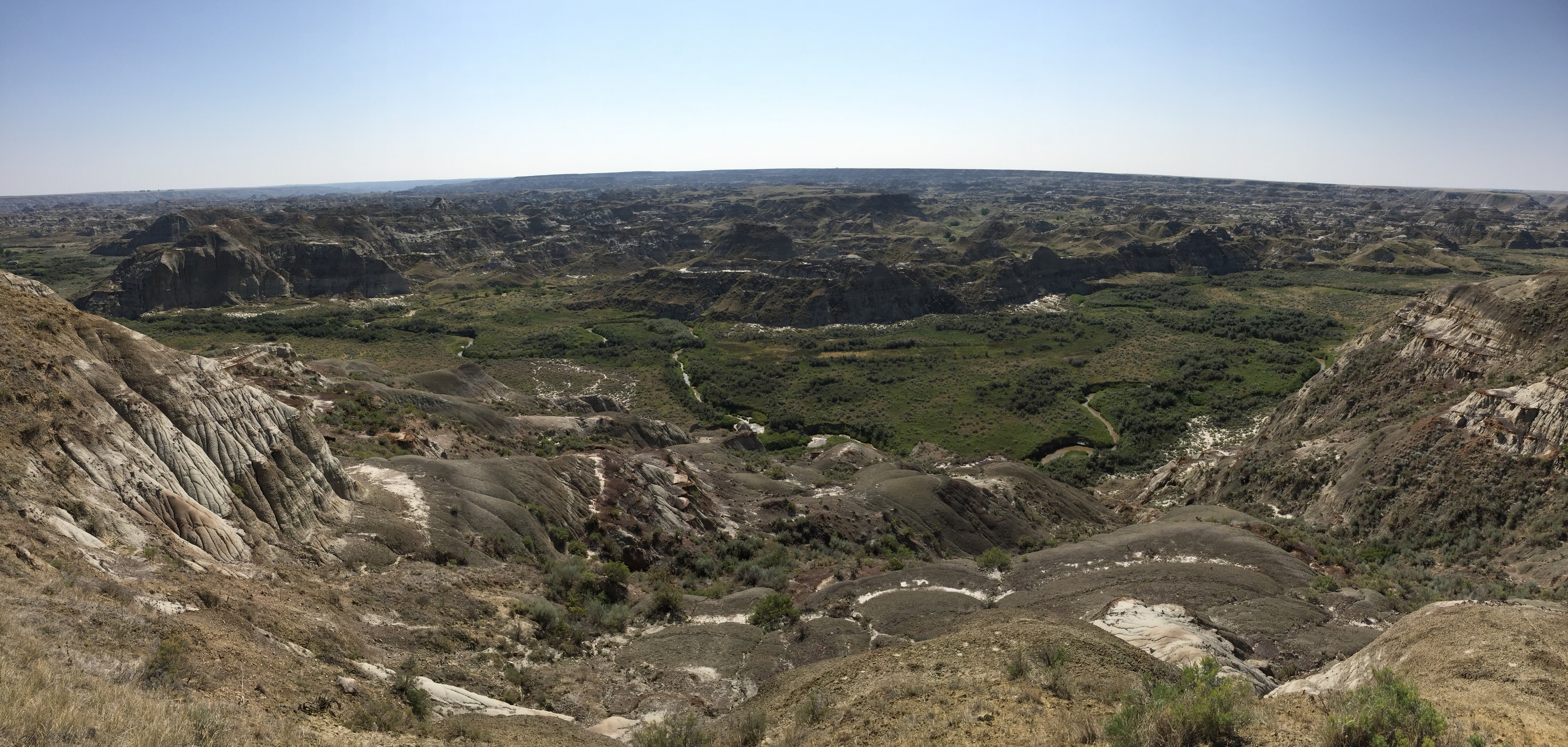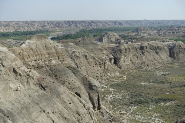 Lorsqu’on arrive à Dinosaur Provincial Park, on découvre que l’ensemble du parc se trouve en fait au dessous du niveau du plateau. Le parc s’ouvre comme un gouffre au milieu des plaines, et on se croirait dans un désert aride.